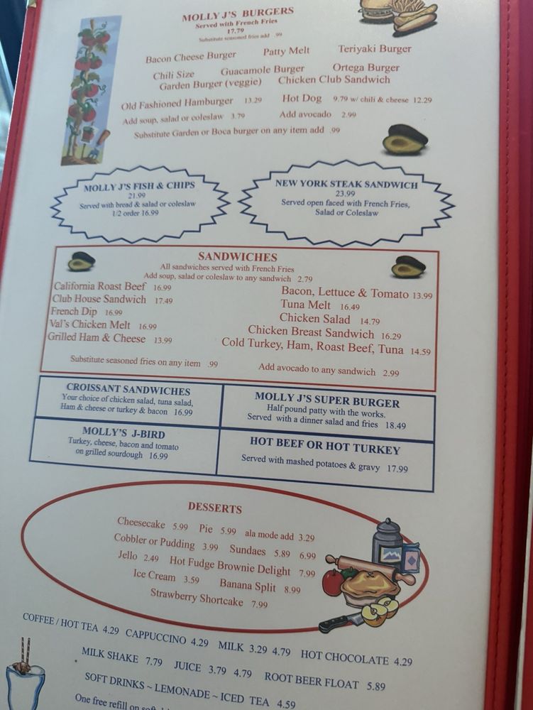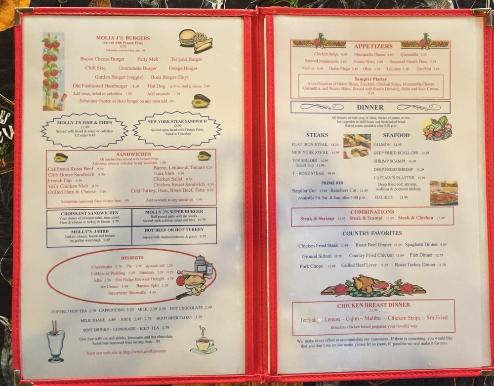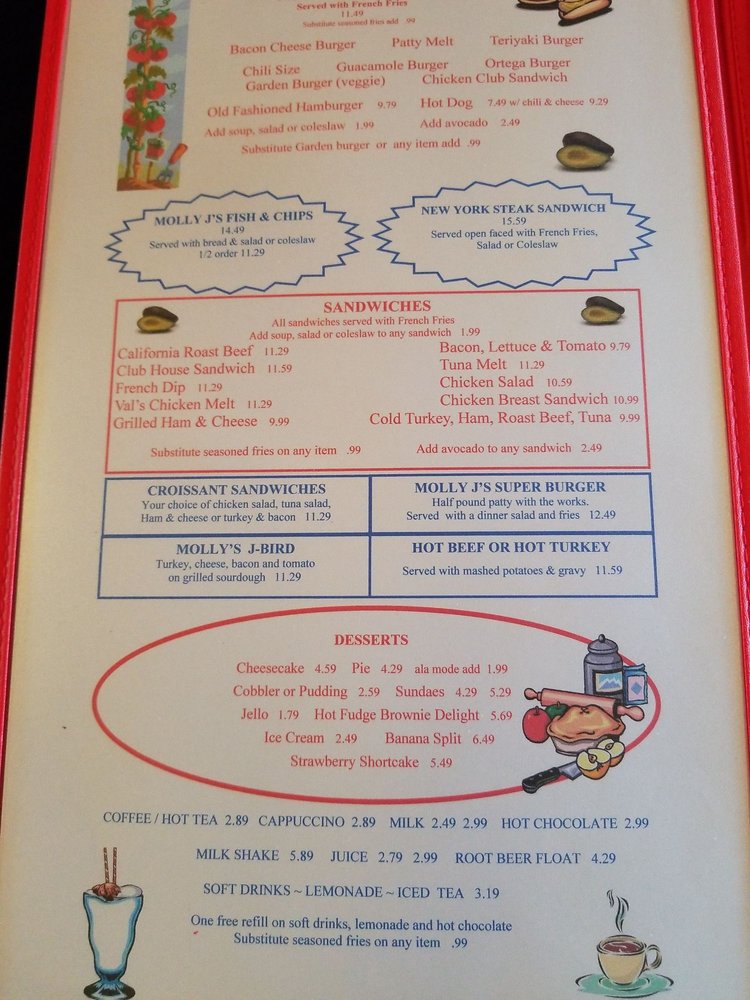 Molly J's is a popular American diner located in Bakersfield, CA. Known for its extensive menu offering breakfast, brunch, lunch, and dinner, Molly J's caters to a variety of preferences, including vegetarian options. The restaurant provides a casual dining experience with amenities like outdoor seating, waiter service, and TV screens. Customers have praised the generous portion sizes and reasonable prices, making it a great spot for families and groups. The food receives high marks for being flavorful and well-prepared, with standout dishes like the French dip sandwich, corned beef hash, and delicious pizzas like the Chicken Tikka Masala and Palak Paneer. With a cozy atmosphere and friendly staff, Molly J's is a must-try spot for a satisfying meal in Bakersfield.